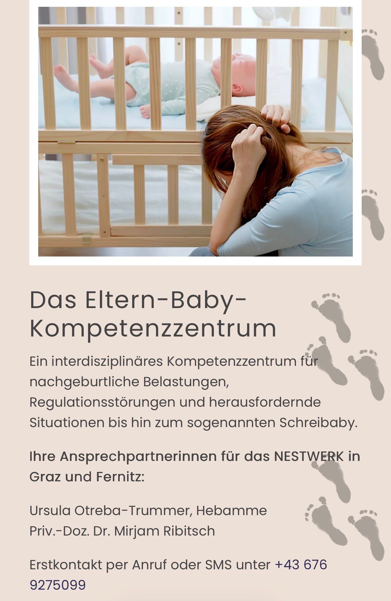 Wir bieten zusätzlich die Möglichkeit, sich in unserem interdisziplinären Eltern-Baby-Kompetenzzentrum NESTWERK, Hilfe zu holen. Nachgeburtliche Belastungen, Regulationsstörungen bis hin zum Schreibaby können Themen sein. Sie finden dazu einen eigenen Button auf meiner Homepage.